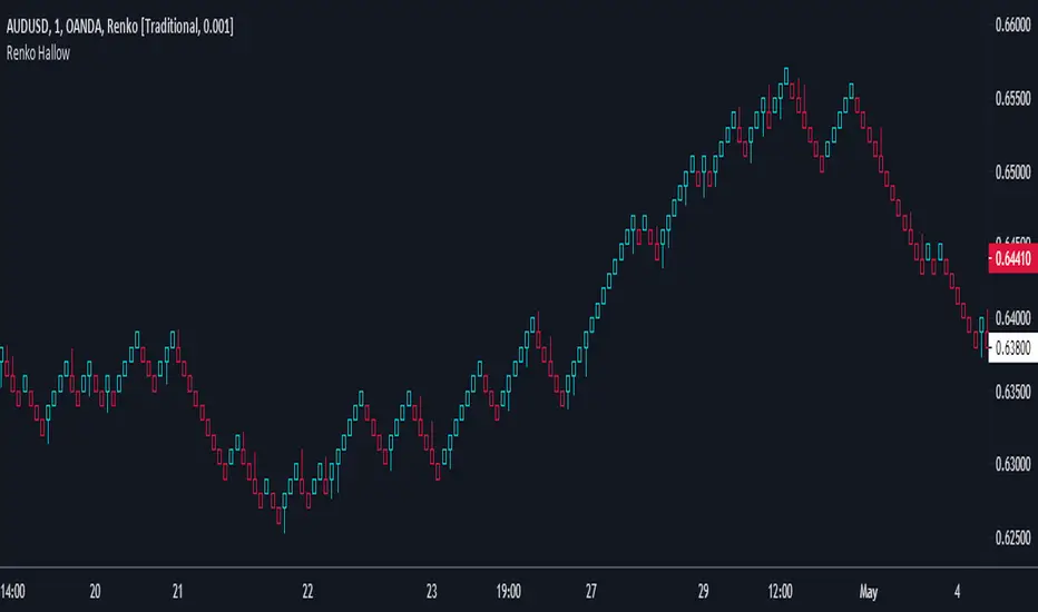 Personal style, I prefer my candlestick to be hallow, so I design one for Renko Chart since TV does not has it on preset. To use this indicator, u have to open a Renko chart and hide the actual Renko chart.