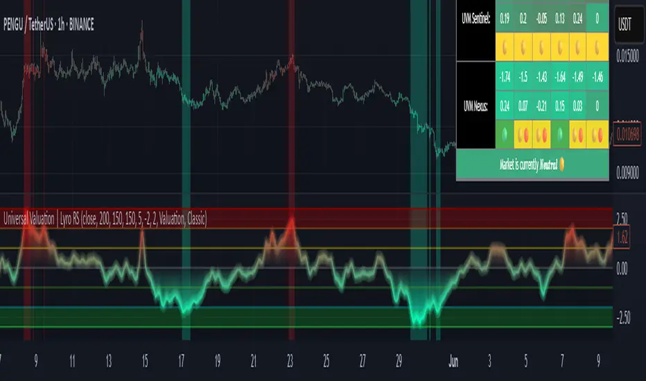 - INPUTS: The Universal Valuation indicator offers flexibility through its customizable input sections. The "Indicator Settings" let you adjust lengths for the raw indicators and statistical functions. The "Signals" section defines thresholds for background color changes, helping you visually spot key market moments. The "Colors" section allows you to pick from pre-defined schemes or personalize colors for better clarity. Lastly, the "Tables" section gives you full control over the UV table’s size and positioning, including options to overlay it on the chart or place it in the allocated space.