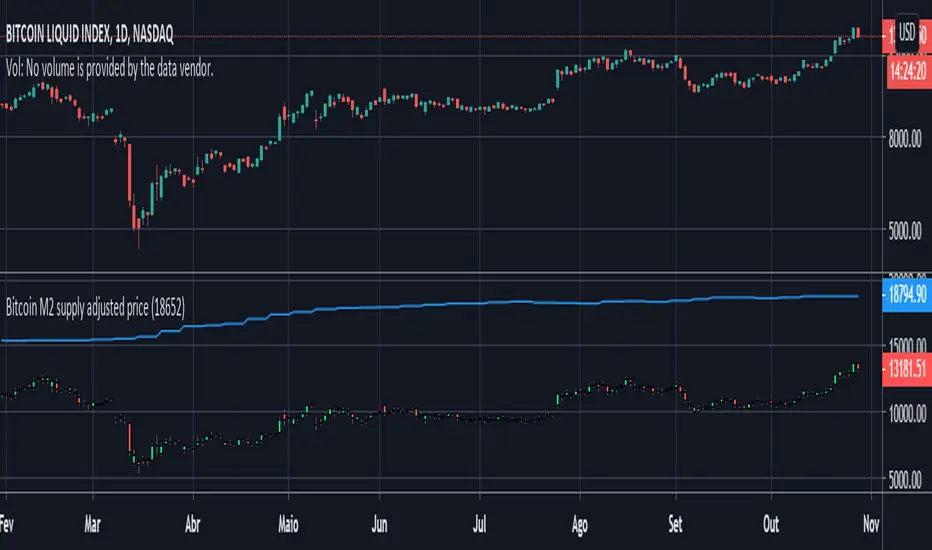 This script plots bitcoin candles adjusted by M2 supply (blue line), helping the trader to obtain insight of new support/resistance levels adjusted by M2 supply.