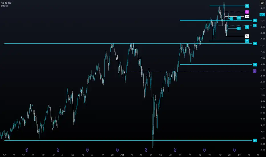 It's best to use this indicator with a separate indicator that color codes your chart's candles according to their Strat Scenario (1, 2, 3) and use top-down analysis to gauge whether to view levels as a sign of continuation, reversal, or exhaustion risk.