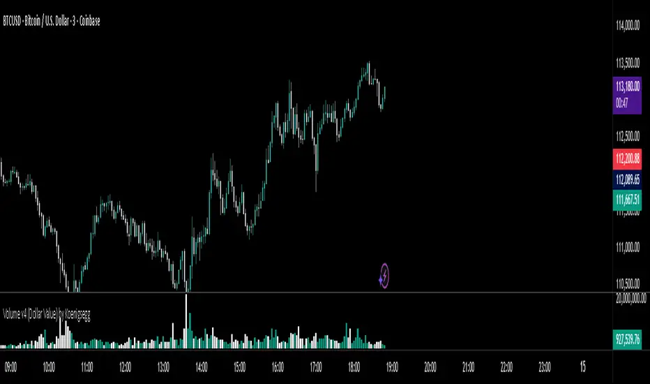 Volume v3 (Dollar Value) by Koenigsegg transforms traditional raw-unit volume into dollar-denominated volume, revealing how much money actually flows through each candle.
