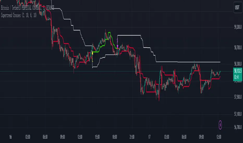 The "Supertrend Crosses" indicator offers a straightforward approach to identifying potential trend reversals and trade entries using the crossover of two Supertrend lines. It provides clear visual signals and alert notifications, making it a valuable tool for traders looking to incorporate trend-following strategies.
