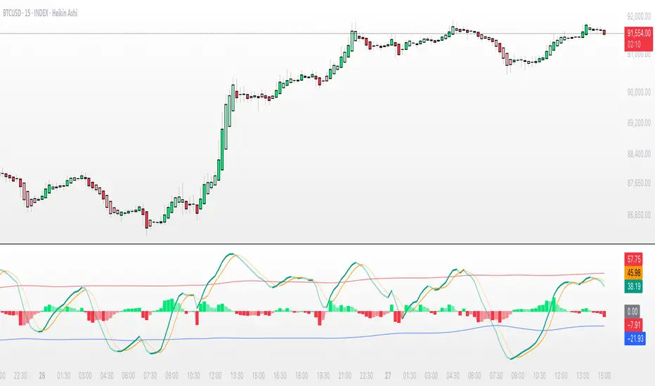 While standard WaveTrend uses price averages alone, this tool feeds a cumulative hybrid OBV source into WT1/WT2, producing a much more sensitive, order-flow-aware momentum signal. The result is a clean, MACD-style histogram built from the slope of WT1, revealing when volume-backed momentum flips from bullish to bearish and vice-versa.