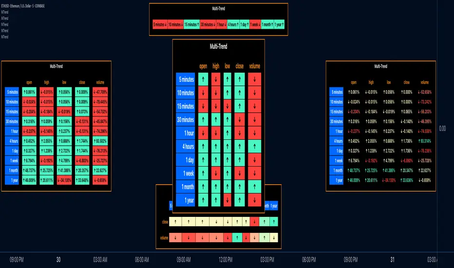 Multi-Trend is an indicator that simplifies the task of tracking market trends across up to 10 custom timeframes. With the flexibility to select your preferred timeframes, with current or any specific data in past, this indicator offers a clear visual representation of the market's direction.