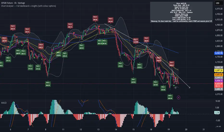 Chart Analyser — Full dashboard + insights (Pine v5) A composite overlay that combines EMA trend, VWAP, RSI, ADX, MACD, ATR, Bollinger Bands, volume context, and pivot S/R into a single charting tool. It marks pivots directly on candles (labels + plotshape) and provides a fixed top‑right dashboard with metric readouts and a one‑line “takeaway” bias. Highly configurable colors and thresholds make it suitable for intraday and swing trading.