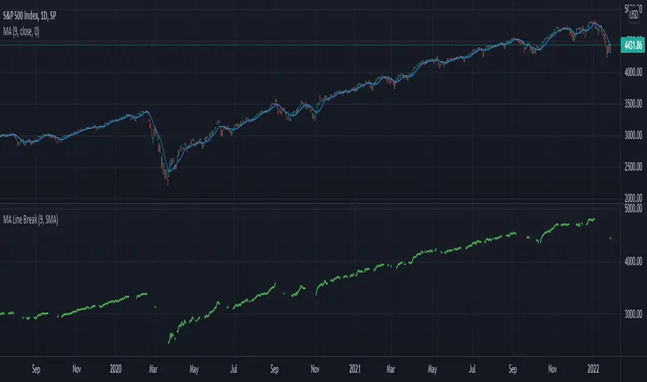 When the security closes above the specified moving average a chart line will be plotted. When it closes below the moving average, no chart line is plotted. A very simplistic way to see the trends a security has when respecting a specific moving average.