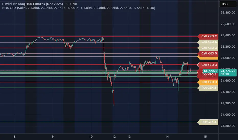 This indicator plots horizontal levels based on batched GEX levels for NQZ2025/MNQZ2025. The batched data is derived from contracts expiring: 0DTE, 1DTE, EoW, EoM, Next Week, Next Month and 3-months out. Labels are available for a high-level view of which levels are which. Hovering (or long-pressing on mobile TV) over the labels will display the nominal values and Rank. This script is manually updated and may not be always updated.