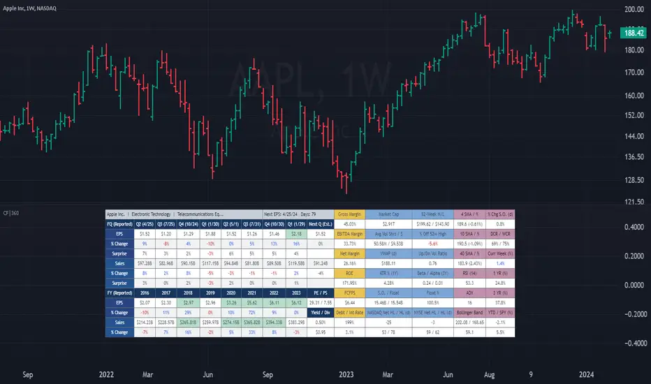 The dashboard is strategically divided into five distinct sections, each color-coded for user-friendly navigation. A quick glance at the dark blue "Fundamentals" table reveals two years of quarterly EPS and Sales data, YoY % change, and Surprise %, complete with report dates. Users can explore eight years of annual data and choose between Non-GAAP EPS, Diluted EPS, and Basic EPS for versatile analysis. Opting for Non-GAAP EPS also unveils next quarter estimates. The Fundamentals section further encompasses P/E and P/S data, alongside TTM dividend and dividend yield information.