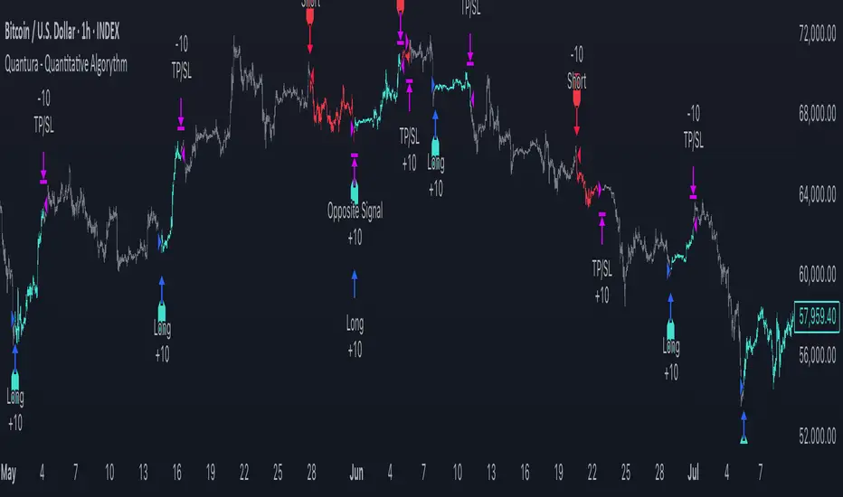 “Quantura – Quantitative Algorithm” is an invite-only Pine Script strategy designed for multi-timeframe analysis, combining technical filters with user-adjustable fundamental sentiment. It was primarily developed for cryptocurrency markets but can also be applied across other assets such as Forex, stocks, and indices. The goal is to generate structured trade signals through a confluence of techniques rather than relying on a single indicator.