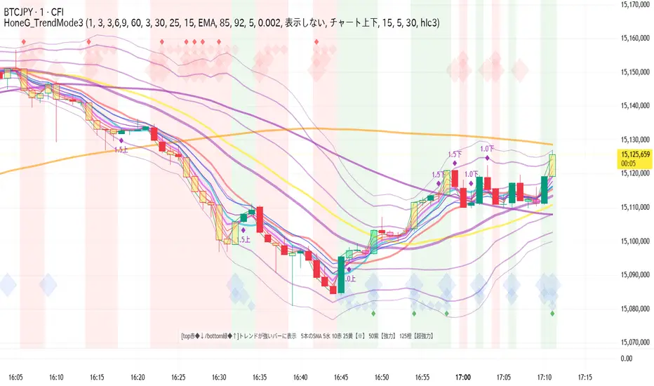 小技としてローソク足がボリバン2シグマにタッチすると、ローソク足の色が黄色に変わる機能も付けてます。