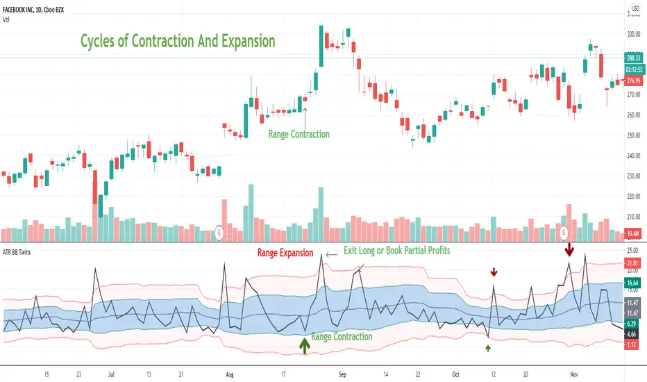 Markets go through cycles of contraction and expansion. Range Expansion is identified when ATR is rising above the ATR average. Range Contraction is identified when ATR is falling below ATR average.