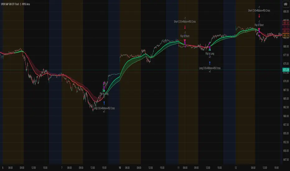 Bull cross + CVD > 0 + RSI Bull (+ filters) → enter Long (or flip from Short to Long).