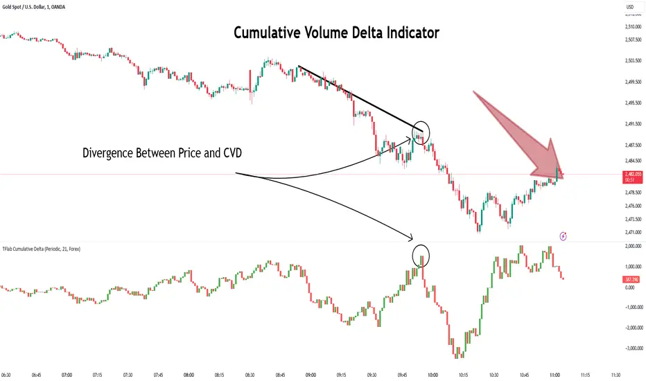 Most traders interpret this as a possible reversal from a bearish to a bullish trend. Similarly, if gold reaches a new high but CVD fails to do the same, it can suggest that buyers lack the strength to push the market higher, indicating a possible trend reversal.