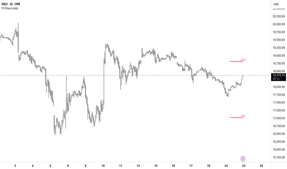 This Pine Script indicator is designed to visualize potential price limits (e.g., daily price limits used in some markets like commodities) on a TradingView chart. It calculates and plots lines representing percentage-based price limits above and below a reference price (typically the previous day's close). The indicator allows you to customize the displayed price limits, their appearance, and how they extend across the chart. It's particularly useful for intraday traders who need to be aware of potential price ceilings and floors.