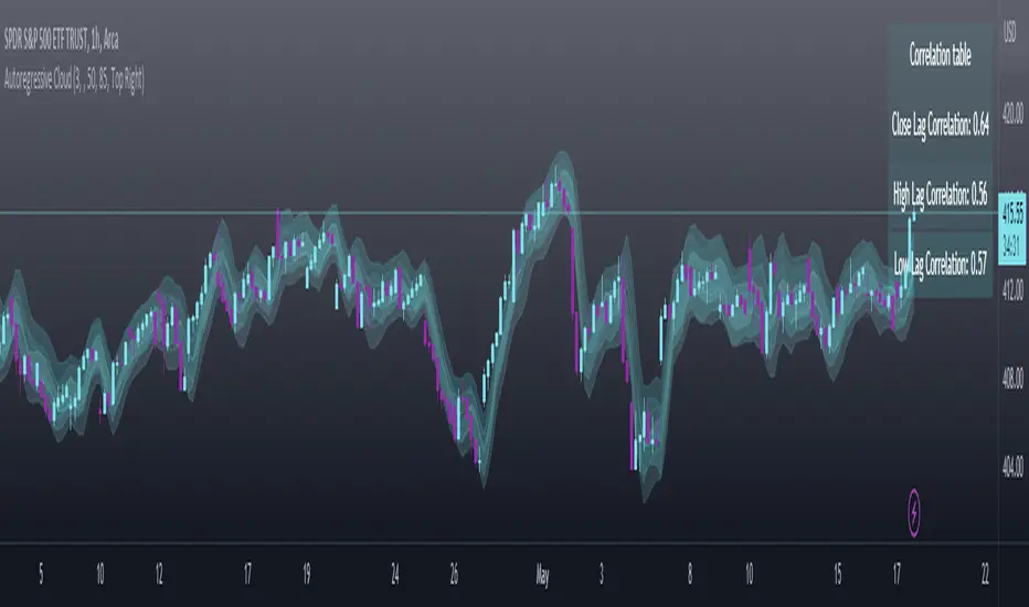 The indicator calculates autoregressive values for the close, high, and low prices of a security based on the specified lookback length (which is defaulted to 50). It then plots three sets of clouds representing the smoothed autoregressive values for each price component (done using the SMA function). The transparency of the clouds can be adjusted using the "Transparency" input. Additionally, the code includes a correlation table that displays the correlation coefficients between the lagged values of the close, high, and low prices. The table's position can be customized using the "Position" input.