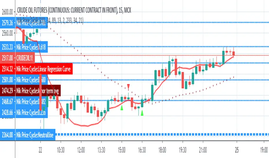 Every script follow a pattern in their price cycle. This can be defined by division of price cycle. Division line will act as pivot point.Above this bar this any price movement is indication of bullish trend while below this line any price movement is indication of bearish trend. This Nik price signal will give great result in combination of magicsignal which is also one of our developed signal. Although we have included various calculation for analysis purpose in this indicator. i suggest to go in setting and uncheck all channel lines and shapes for getting clear picture of trend and entry point. for more details on how to use this indicator people can message us