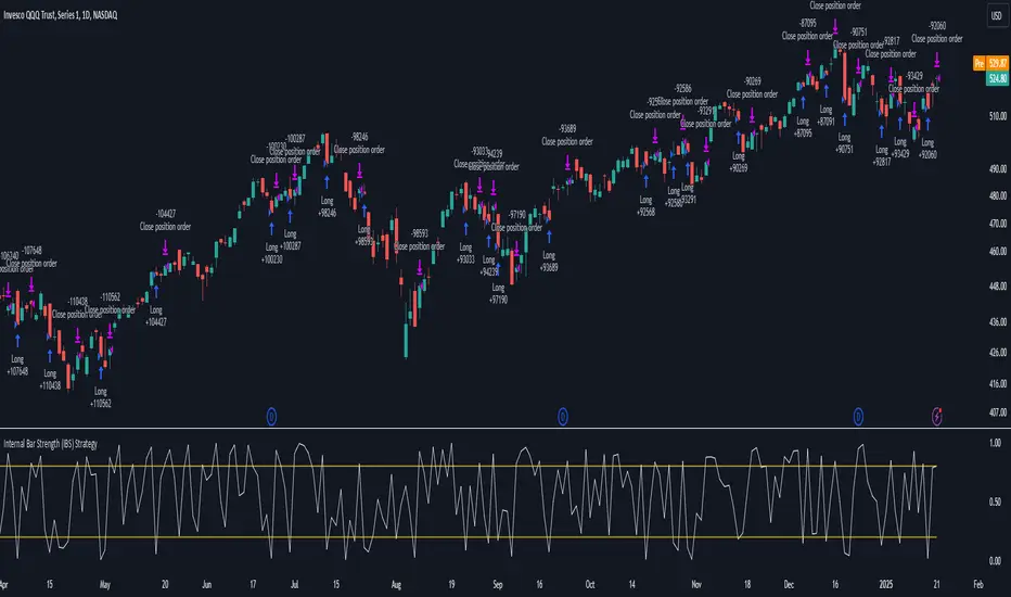 The "Internal Bar Strength (IBS) Strategy" is a mean-reversion strategy designed to identify trading opportunities based on the closing price's position within the daily price range. It enters a long position when the IBS indicates oversold conditions and exits when the IBS reaches overbought levels. This strategy was designed to be used on the daily timeframe.