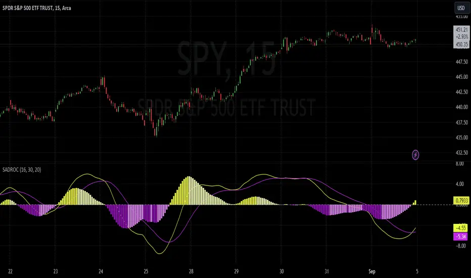 Calculations: The indicator calculates cumulative volume and then computes the Accumulation/Distribution (AD) value based on price and volume data. The SADROC is calculated as the Rate of Change of the exponential moving averages of the price. The difference between these two values is further smoothed to generate the final SADROC value.