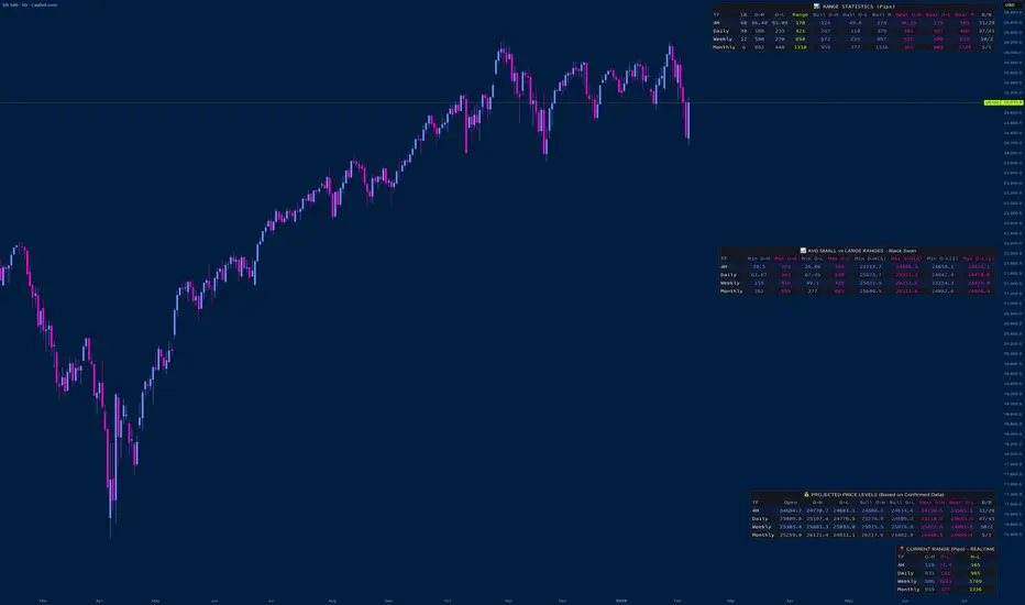 A comprehensive statistical analysis tool designed for institutional-grade market range assessment across multiple time horizons. This indicator provides quantitative volatility measurements and predictive price level projections based on historical market behavior patterns.
