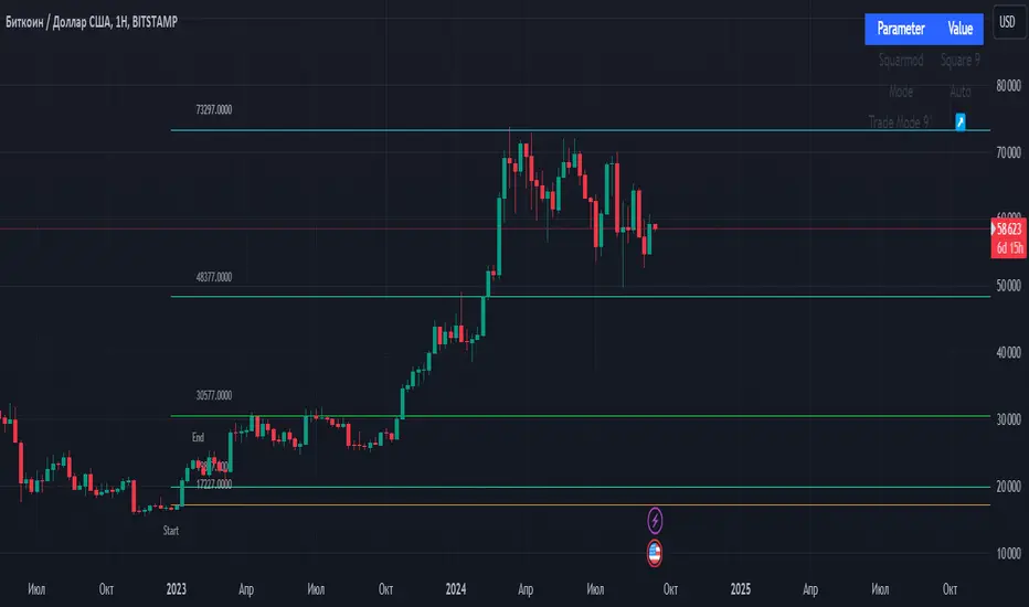 The indicator allows for the automation of level construction using this method. Moreover, it includes not only the Square of 9 but also the Square of 4 and the Circle of 12, which are also very important in William Gann's methods.