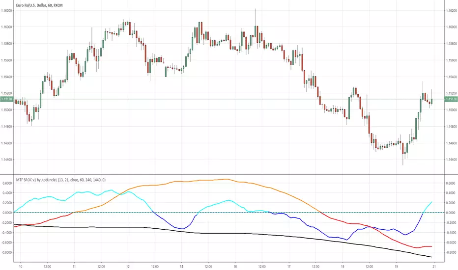 This study plots Smoothed Rate of Change (SROC) indicators for up to 4 different time frames. The indicator does not use higher time frame data, so will not re-paint. The SROC is a momentum indicator and can be used in ranging or trending markets, please refer to the reference for further details of how to use the indicators.