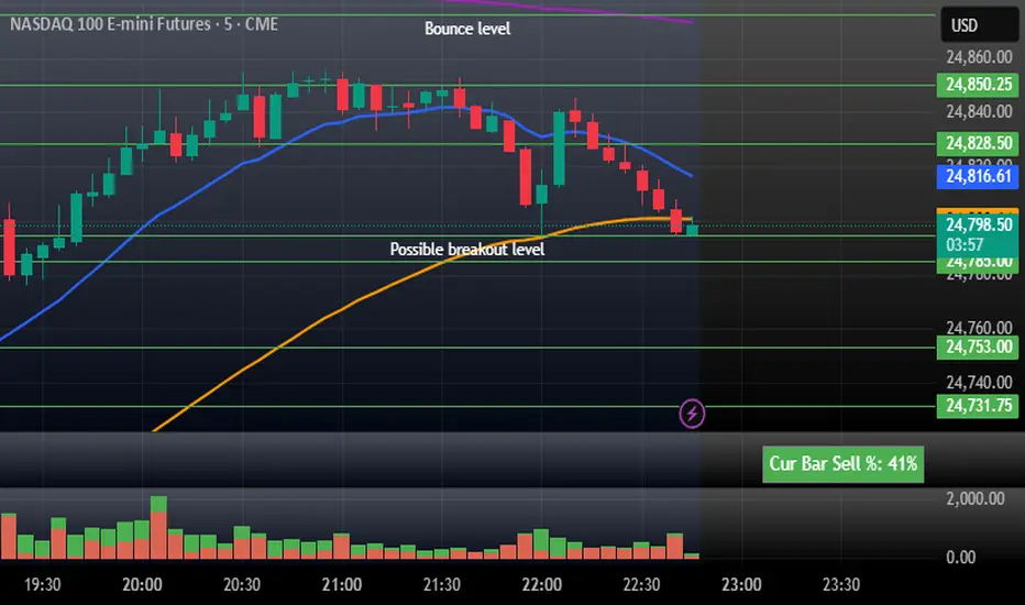 Current Bar Sell + Stacked Buy/Sell. This indicator helps tell the story of momentum on the current bar. If the % is high then it is bearish. Low it is bullish.