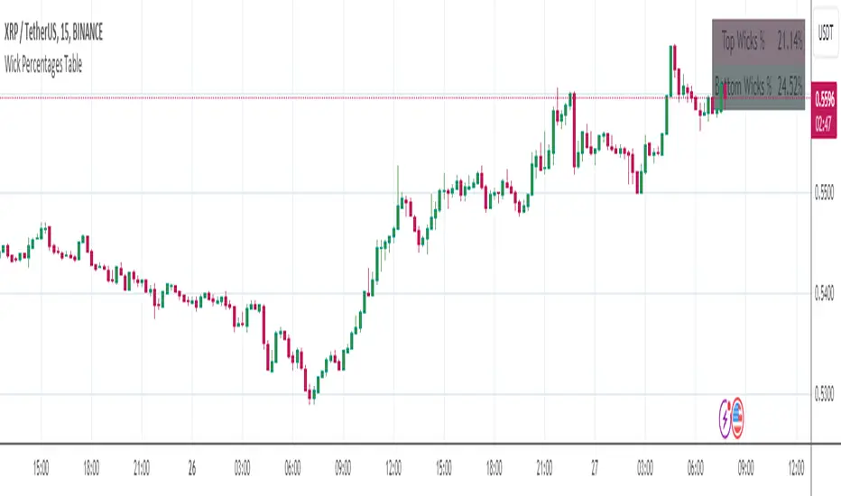 Table Display: It creates or updates a table displayed on the top right of the chart showing these percentages. The table has two rows: one for the "Top Wick %" and another for the "Bottom Wick %", with the corresponding percentages calculated and displayed.