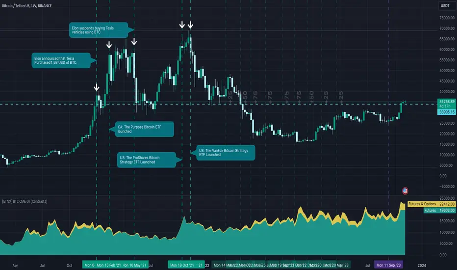 This indicator displays the Open Interest based on CME Bitcoin Futures & Options. The data is provided from the CFTC Commitments of Traders Reports. These reports are given weekly. Therefore, this indicator works better on W timeframes.
