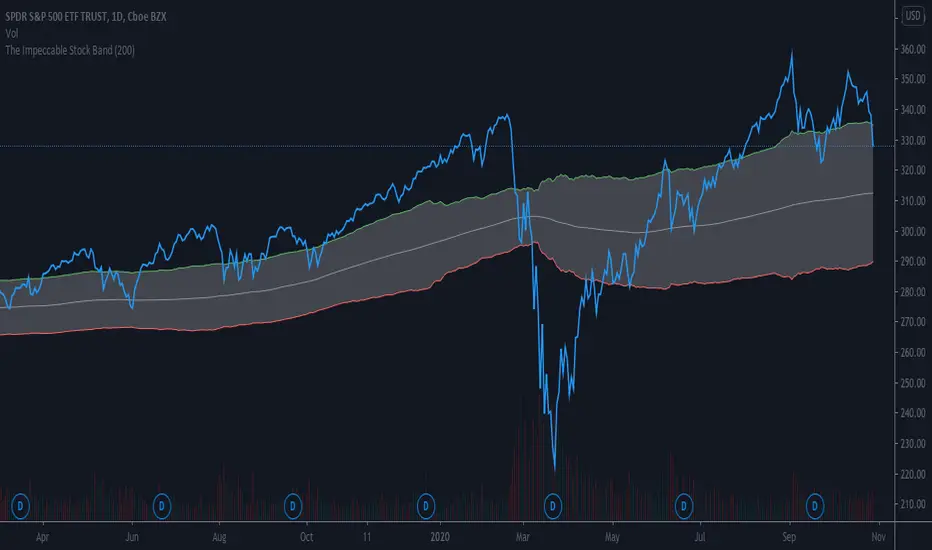 The top most and bottom most yellow lines are 4 standard deviations of historical volatility which give an idea of where the floor and ceiling are. This helps investors and traders identify good buy and sell zones using the yellow lines to see overbought and oversold sides.