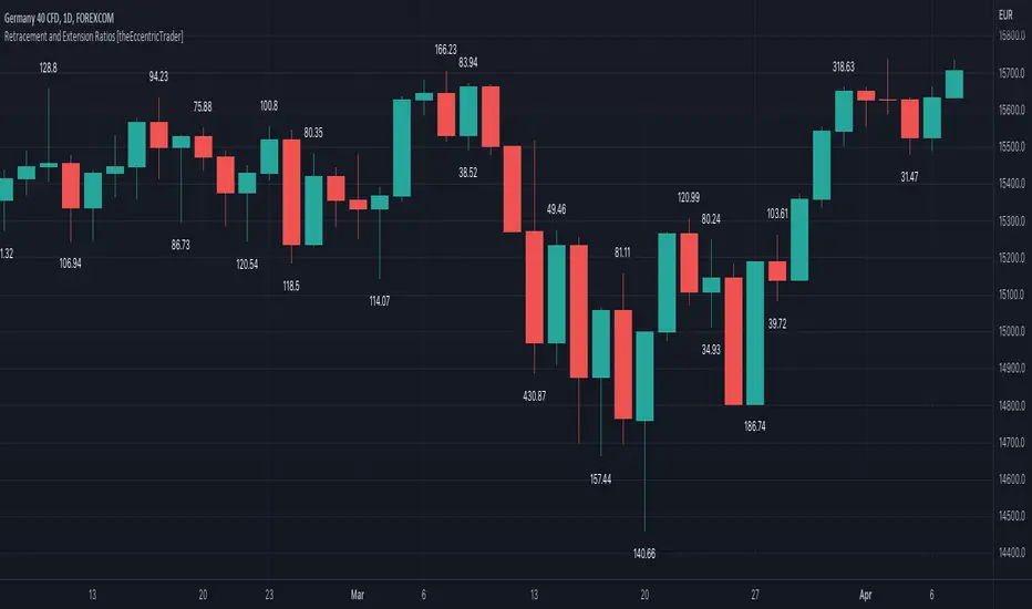 Retracement and extension ratios are calculated by dividing the current range by the preceding range and multiplying the answer by 100. Retracement ratios are those that are equal to or below 100% of the preceding range and extension ratios are those that are above 100% of the preceding range.
