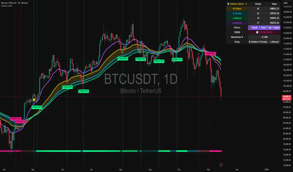 Hellenic EMA Matrix is a premium indicator based on mathematical constants of nature: Phi (Phi - Golden Ratio), Pi (Pi), e (Euler's number). The indicator uses these universal constants to create dynamic EMAs that adapt to the natural rhythms of the market.