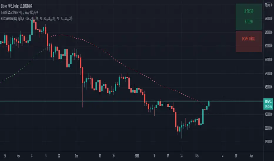 The screener works by scanning through up to 10 symbols and list down symbols that are currently breaking the high or low mean averages as definied by the Gann Hilo Indicator. Once you add it, 2 panels will be added to your chart - the green panel will list the symbols reversing into a bullish trend and the red panel will show the symbols reversing into a bearish trend.