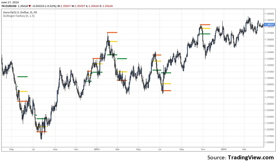 Set spread value from your broker, eg my broker has a spread of 0.0003 for EURUSD. You can set your required profit ratio eg 1.5 means risk 1 to win 1.5. Enter if price crosses orange (or set a buy stop order or sell limit order) and set stoploss at red and take profit at green. Setup lasts for 20 bars. If it doesn't cross the orange in that time, forget it. Long if red is below orange, short if red is above orange. Recommended to be used on 4H, D, W charts only. Use at your own risk. I cannot be held liable for any damages financial or otherwise, directly or indirectly related to using this script and trading strategy.