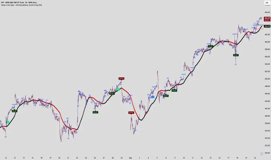 The aim of this tool is educational: to make it easier for traders to study how supply and demand pressures appear on the chart in real time. It does not generate trading advice, but instead plots markers based on classical VSA principles so students of the method can recognize strength, weakness, confirmations, and traps without the cryptic complexity often found in raw VSA study.