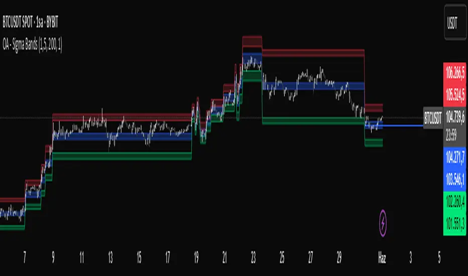 The OA - Sigma Bands indicator is a fully adaptive, volatility-sensitive dynamic band system designed to detect price expansion and potential breakouts. Unlike traditional fixed-width Bollinger Bands, OA - Sigma Bands adjust their boundaries based on a combination of standard deviation (σ) and Average Daily Range (ADR), making them more responsive to real market behavior and shifts in volatility.
