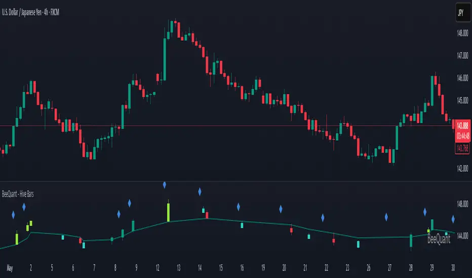 ⬜ Visual Signal Precision: "Hive Bars" spring to life with an intuitively powerful coloring system. While primary colors (Green for upward bias, Red for downward bias) denote the prevailing market direction, the "Hive Bars" indicator introduces distinctively colored "Signal Hive Bars". These specialized bars emerge when the market price exhibits a particularly robust, high-conviction interaction with the adaptive internal baseline, standing out instantly and often mark key turning points or breakouts you want to act on.