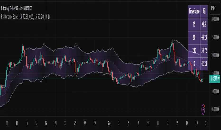 The "RSI Dynamic Bands" indicator is a variant of the Relative Strength Index (RSI) oscillator that brings its signals directly onto the price chart. It displays dynamic bands around the price, adjusted based on RSI levels, enabling easy identification of potential overbought or oversold conditions. The indicator also integrates a multi-timeframe RSI table, facilitating the analysis of trend strength across different timeframes.