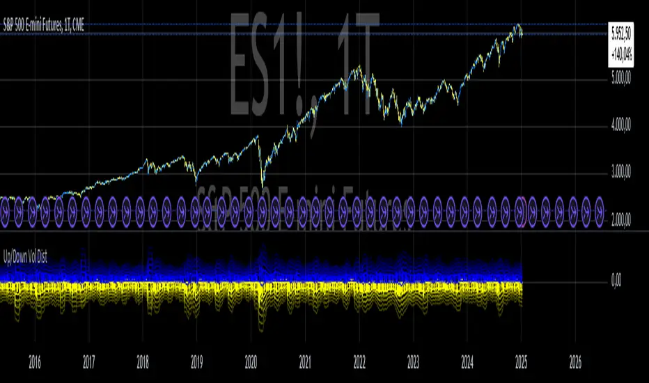 This indicator analyzes the relationship between price movements and trading volume by distinguishing between "up" and "down" volume. Up volume refers to trading volume occurring during price increases, while down volume refers to trading volume during price decreases. The indicator calculates the mean and standard deviation for both up and down volume over a specified length. This statistical approach enables traders to visualize volume deviations from the average, highlighting potential market anomalies that could signal trading opportunities.