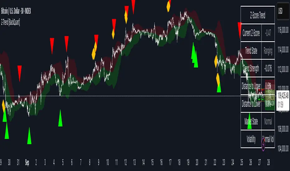 - Signals - Bullish Entry (triangle up) when z exits the oversold zone upward; Bearish Entry (triangle down) when z exits the overbought zone downward; Extreme markers (diamonds) at the extreme bands with a one-bar turn.
