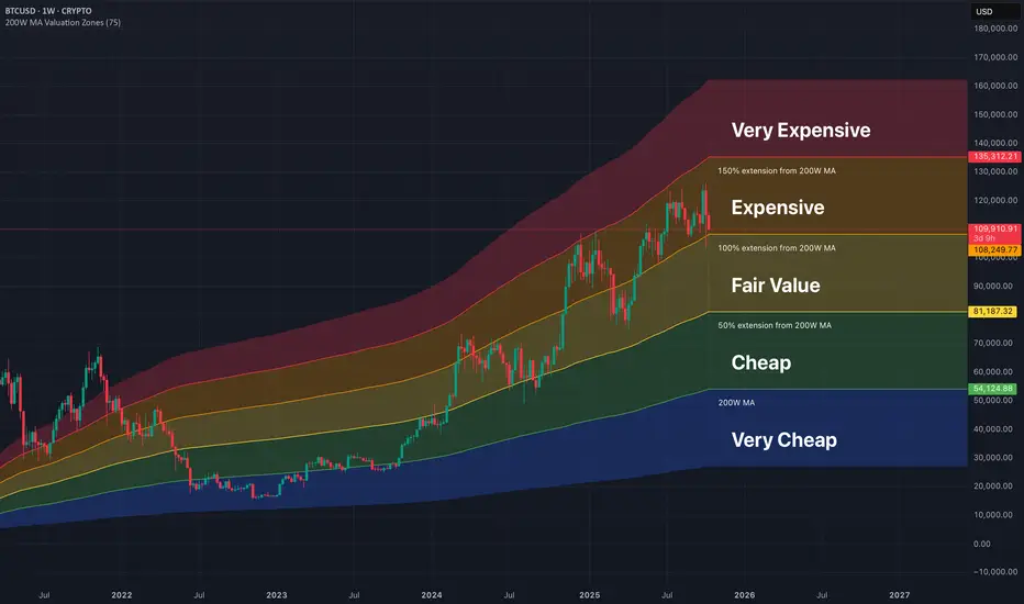 This script visualizes long-term valuation zones based on the 200-week moving average (MA) — a widely followed metric for identifying major market cycle bottoms and tops.
