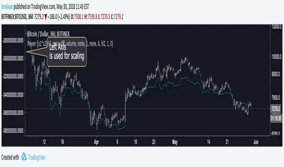 The default settings multiply the change in price (flow) by volume (pressure) which is “money” or “power” (like in an electrical circuit). But, any combination of signals can be multiplied/divided... which might be “power", or something else.