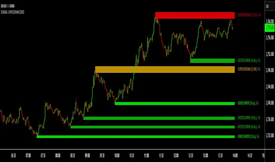 The "3CRGANG - SUPPLY/DEMAND ZONES" indicator is a sophisticated tool designed to identify, classify, and visualize dynamic supply (resistance) and demand (support) zones on your TradingView charts. It goes beyond basic level plotting by incorporating a state-based system that tracks how zones evolve based on price interactions, helping traders anticipate potential reversals, continuations, or breakdowns at key levels. Zones are categorized into states like Untested, Verified, Weak, Flipped, and Broken, providing contextual insights into their strength and reliability. This indicator is particularly useful for swing traders, scalpers, and position traders who rely on price action around institutional levels, as it filters noise and highlights actionable zones with customizable alerts and visual aids.