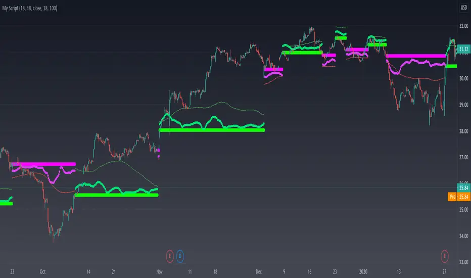 Plots the price level that the most recent EMA crossover occurred at(Green if bullish and red if bearish).