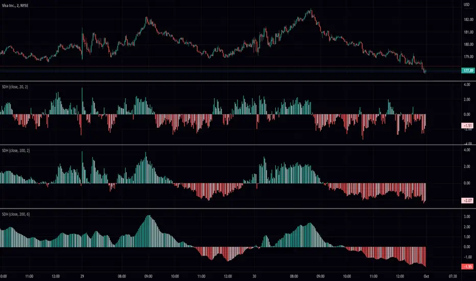This script tells you what standard deviation the price is from the mean. Due to the limitations of the calculations this study only works for stocks. Further limitations include and inability to calculate past 10 deviation. I have added a smoothing feature and the ability to change the colors. Dont be afraid to change the style to line instead of a histogram. Enjoy!