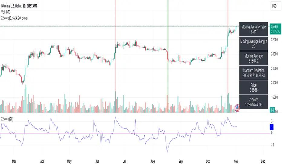 Visual Signals: Z-Score conditions are represented visually on the chart with color-coded background highlights. Overbought conditions are marked with a red background, while oversold conditions are indicated with a green background.
