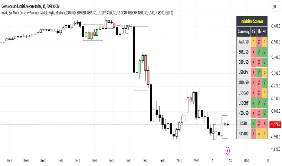 This script is an Inside Bar Scanner that allows you to monitor multiple currency pairs across different timeframes (15 minutes, 1 hour, and 4 hours). Its main features include: