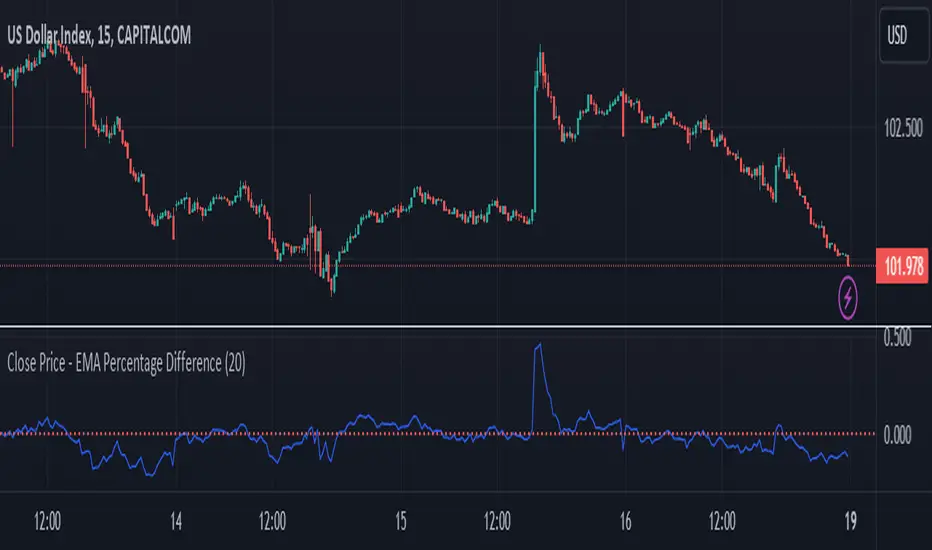 The Close Price - EMA Percentage Difference Indicator is an essential tool designed to calculate and display the percentage difference between the closing price of a security and its Exponential Moving Average (EMA). This indicator is particularly useful for traders and analysts who want to understand how far the current price is from its EMA, providing insights into potential price trends and reversals.