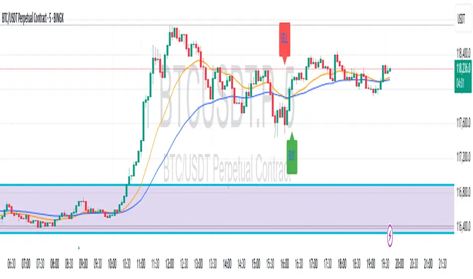 Displays a BUY label below the candle and a SELL label above the candle when signals appear.