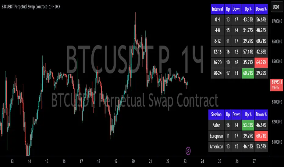 The "Interval & Session Market Statistics" indicator is designed to uncover recurring patterns and market inefficiencies by analyzing market cycles. By breaking down price movements into defined intervals and sessions, this tool helps traders pinpoint periods of strength and weakness—identifying both bullish and bearish trends with clear percentage breakdowns. Its comprehensive visual tables make it easier to detect accumulation, distribution, and potential turning points, providing valuable insights that can be leveraged to optimize trading strategies.