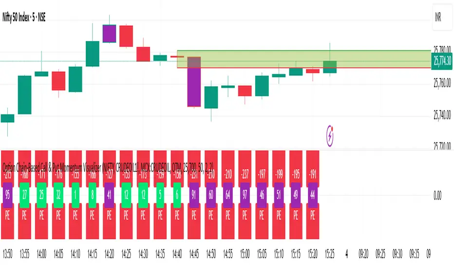The Option Chain-Based CE/PE Momentum Visualizer is a powerful analytical tool designed to track real-time momentum and sentiment shifts between Call (CE) and Put (PE) options directly on the chart. It offers deep insight into option buyers’ and sellers’ behavior by analyzing multiple strikes, dynamically calculating cumulative CE/PE strength, and correlating it with underlying index price movements.